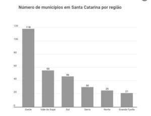 A região Oeste é a campeã em fragmentação territorial. São 118 municípios, sendo que 66 não ultrapassam a linha dos cinco mil habitantes. A diferença é grande quando comparada com o Vale do Itajaí, segunda região mais fragmentada, que tem apenas 55 cidades. Na sequência, estão o Sul (46 cidades), a Serra (30), o Norte (25), e a Grande Florianópolis (21).