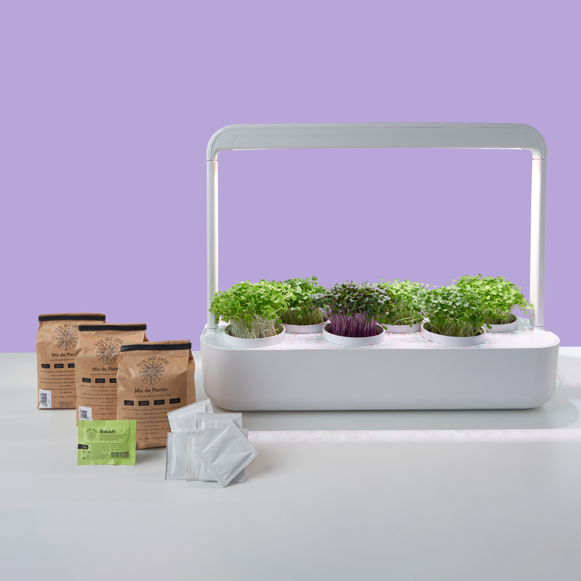 Com sistema inteligente que permite a plantação de maneira automatizada, o produto possui seis compartilhamentos diferentes, sistema autoirrigável de até 25 dias de autonomia, iluminação automática e também um mix de plantio e sementes selecionados da Yes We Grow – que tem a função de substituir adubo e a terra com o mix correto entre os ingredientes.
