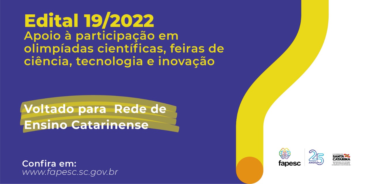 A Fundação de Amparo à Pesquisa e Inovação do Estado de Santa Catarina (Fapesc) tem uma chamada pública voltada para a Rede de Ensino Catarinense (REC). O objetivo é apoiar a participação de estudantes e professores em olimpíadas científicas, feiras de ciência, tecnologia e inovação e competições similares.