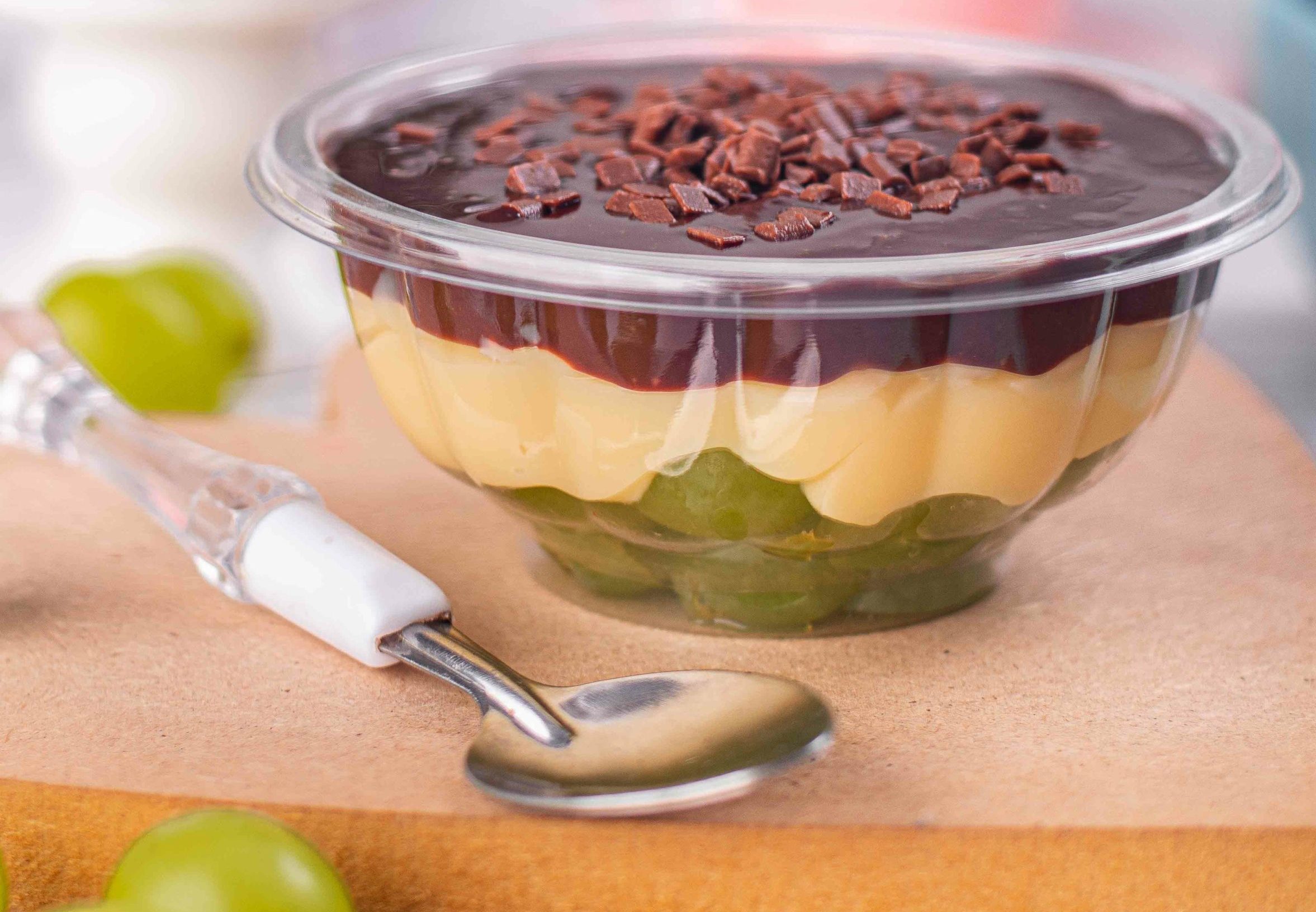 – Em um refratário, coloque todo o creme branco, forre o creme com as uvas Mimo Green Dreams e despeje a ganache de chocolate por cima e, em seguida, o granulado.
