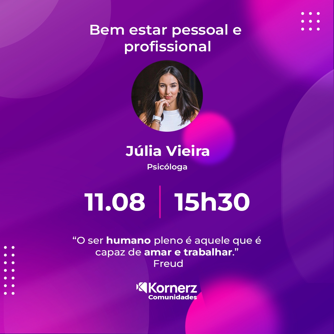 São Paulo, agosto de 2022 – Na próxima quinta-feira, 18 de agosto, às 19h30, acontecerá no app Kornerz, o Kornerz Talks. Desta vez, a palestra será ministrada por Júlia Vieira, psicóloga e coordenadora de RH, com o tema: Bem-estar pessoal e profissional. “O pessoal e o profissional andam juntos, principalmente quando conseguimos alinhar aquilo que acreditamos, com o que expressamos”, explica a psicóloga.