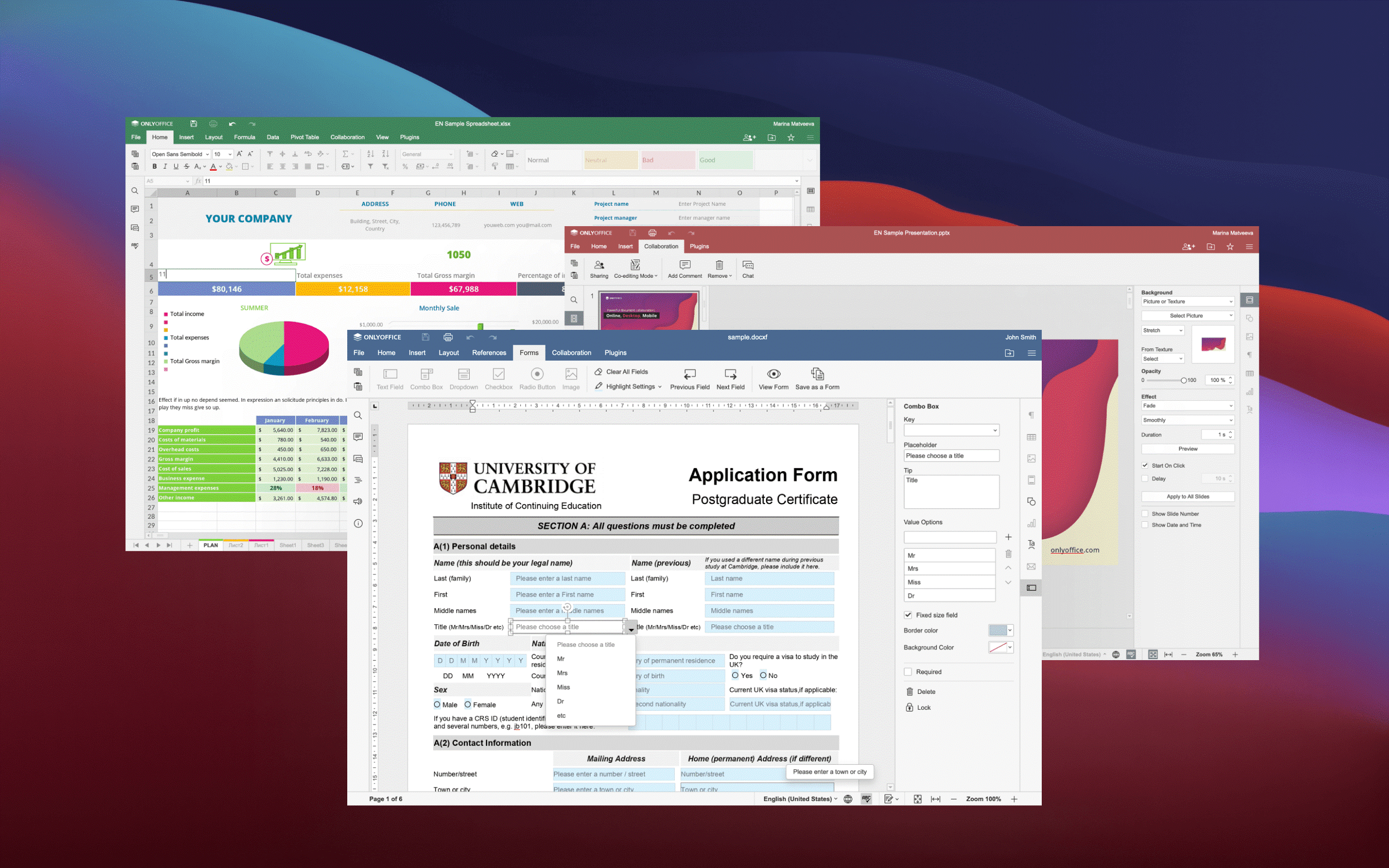 O ONLYOFFICE Docs é um pacote de escritório baseado na Web desenvolvido pela Ascensio System SIA, uma empresa de desenvolvimento de software com sede na Letônia. Esta ferramenta de software permite que você crie, edite, compartilhe e colabore em documentos de texto, planilhas, apresentações e formulários preenchíveis em seu navegador da web. Ao contrário do Google Docs e do Microsoft Office Online, o ONLYOFFICE Docs é um pacote de escritório de código aberto e auto-hospedado, o que o torna muito seguro por design.