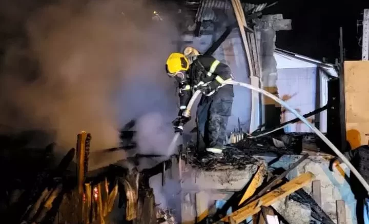 Casa fica destruída e chamas se alastraram para uma residência vizinha; morador de uma das casas foi retirado por vizinhos