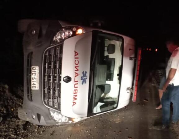 Após passar com o veículo no trecho em obras, o motorista não percebeu que ali haviam cargas de cascalho e atingindo as mesmas e tombando a ambulância sobre a pista.