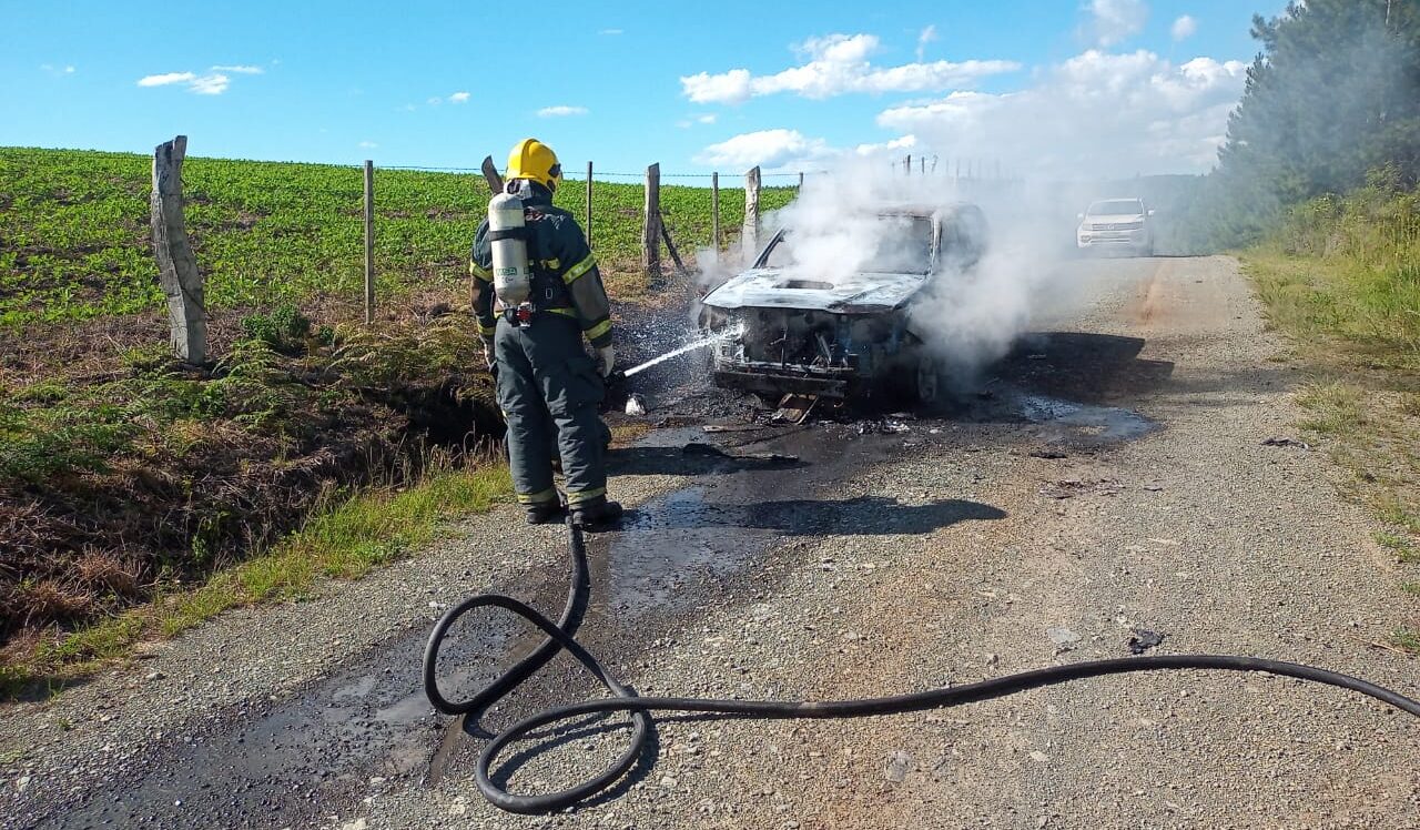 Carro pegou fogo e ficou totalmente destruído ontem, terça-feira 13, em Bom Retiro, na Serra Catarinense, na Estrada Geral do bairro Soledade, no km 152 da BR-282.