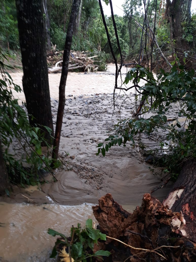Fortes chuvas destroem pontilhão de madeira deixando o tráfego interditado.
