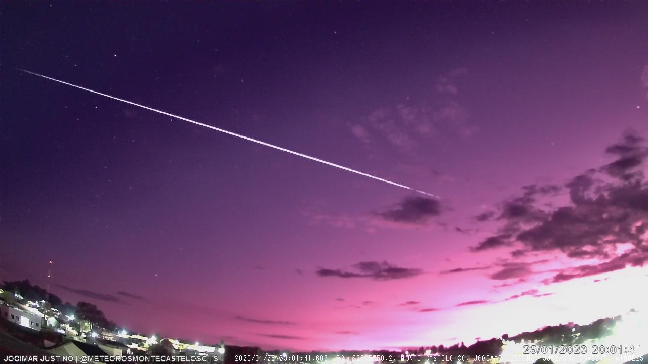 O registro foi feito às 20h01 de quarta-feira (25). A Bramon afirmou que o meteoro passou com uma velocidade de mais de 100 mil km/h. O objeto foi flagrado pelas câmeras de dois astrônomos. Uma em Monte Castelo, no Norte do estado, e outra em Florianópolis.