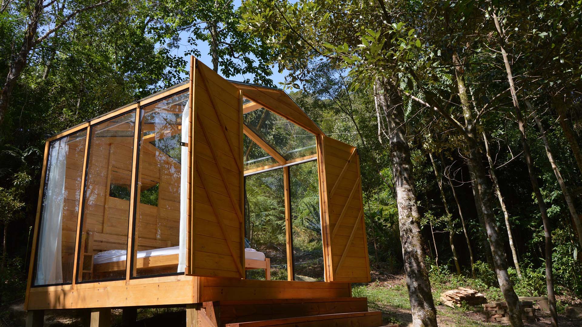 Um quarto simples, quase que totalmente transparente, mas extremamente charmoso, com vidros nas paredes e no teto. A arquitetura da cabana é toda voltada para valorizar a natureza ao redor, além de permitir o super plus de dormir sob as estrelas.