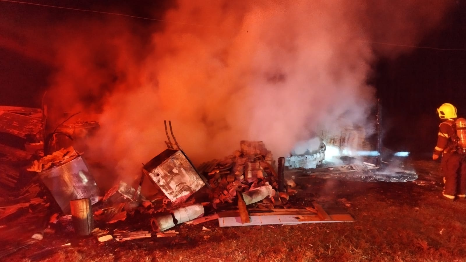 Por volta das 4h da madrugada, um galpão de madeira, de aproximadamente 80m², na Localidade de Caeté, no interior de Alfredo Wagner, pegou fogo e destruiu um veículo, equipamentos e maquinários.