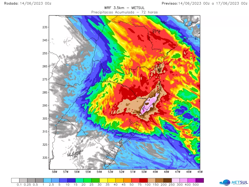 No quadro abaixo os gráficos do modelo WRF com projeção de chuva para as 72 horas para as cidades que tem maior risco. Entre essas cidades tem a projeção de chuva para Morrinhos do Sul com 346 mm, Araranguá 351 mm, Torres 293 mm e Sombrio 292 mm. A MetSul adverte que o volume seria alto se fosse uma projeção mensal, porém é para as próximas 72 horas. Um cenário de grade perigo e risco de desastre nessas cidades e áreas próximas como Criciúma, Turvo, Rondinha, Terra de Areia, Cambará do Sul, Mampituba, Gramado e áreas adjacentes.