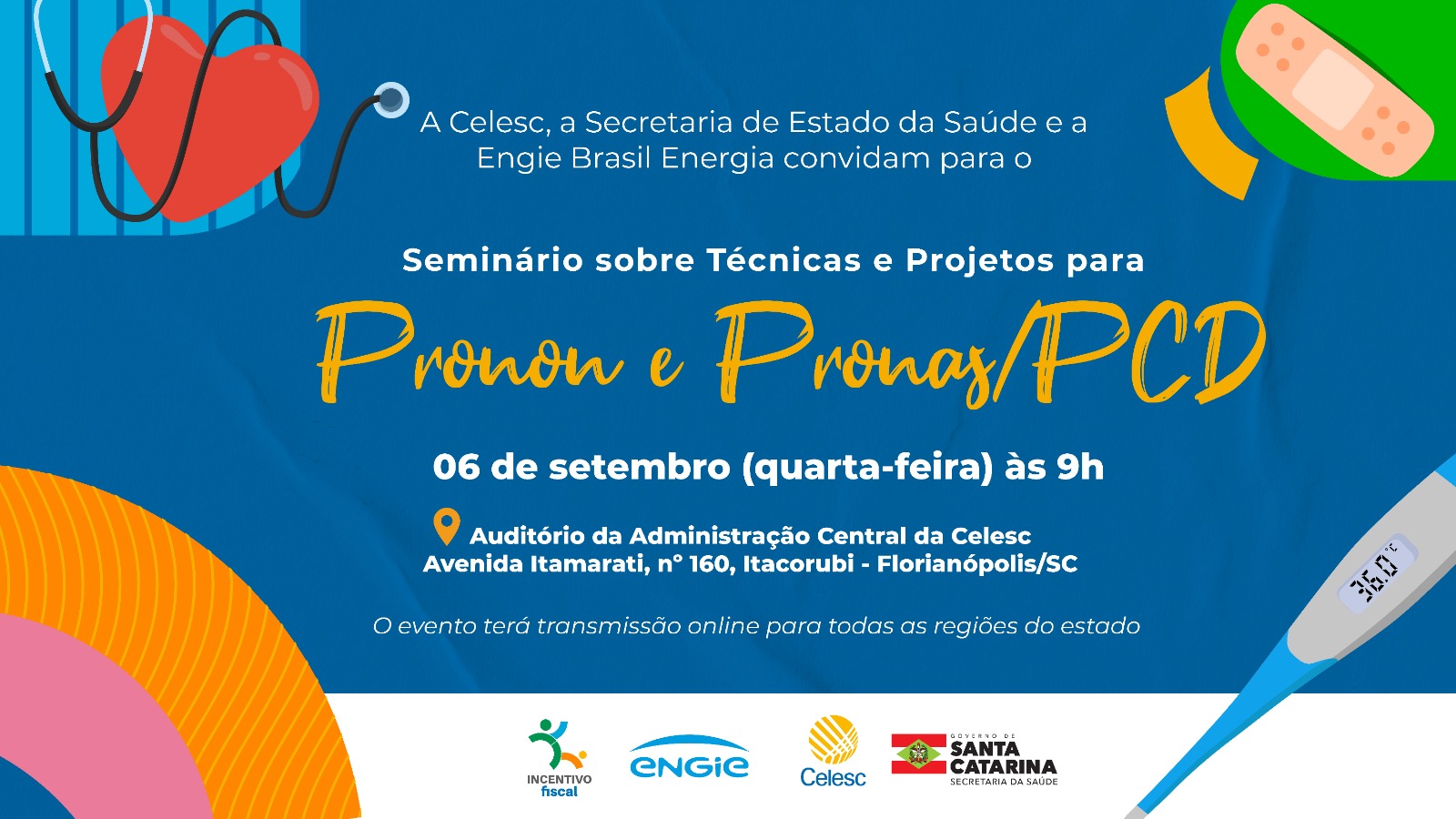 A Celesc, em parceria com a Secretaria de Estado da Saúde e com a Engie Brasil Energia, convida para o Seminário sobre Técnicas de Projetos para Pronas/PCD e Pronon. O evento contará com a presença da secretária de Estado da Saúde, Carmen Zanotto, do Presidente da Celesc, Tarcísio Estefano Rosa, e terá a ministração de Marcos Molinari, analista de Responsabilidade Social da Engie Brasil Energia.