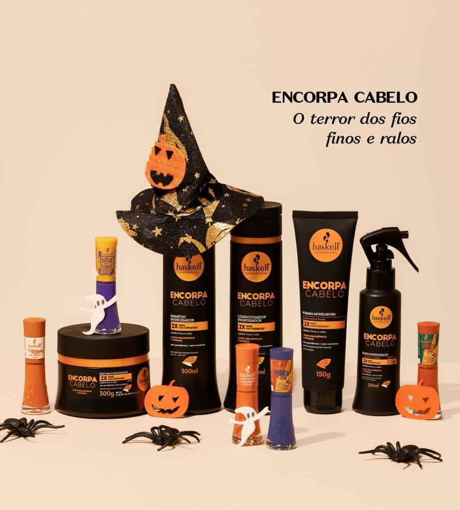 - Ouse nos penteados. Em pesquisas rápidas na internet você encontra várias inspirações fáceis de aplicar. O melhor, é que na maioria das vezes você vai precisar apenas de pente, ligas de cabelo, grampos e pomadas modeladoras. A pomada Encorpa Cabelo da Haskell Cosméticos meuhaskell é Ideal para essas produções de Halloween. Ela modela os cabelos e promove volume extra para finalizar penteados com um acabamento natural;