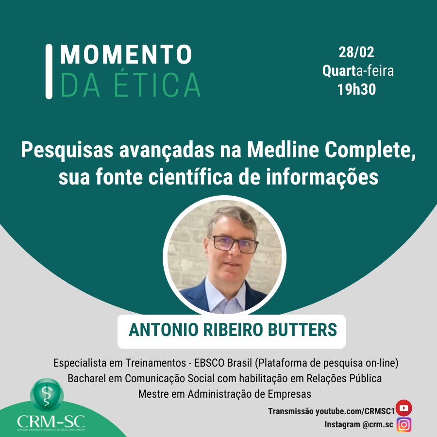 E para apresentar as funcionalidades da solução aos médicos, no dia 28 de fevereiro, o Momento da Ética receberá o especialista em treinamentos da EBSCO Brasil, Antonio Ribeiro Butter, bacharel em Comunicação Social com habilitação em Relações Públicas e Mestre em Administração de Empresas, que abordará as “Pesquisas avançadas na Medline Complete, sua fonte científica de informações”.