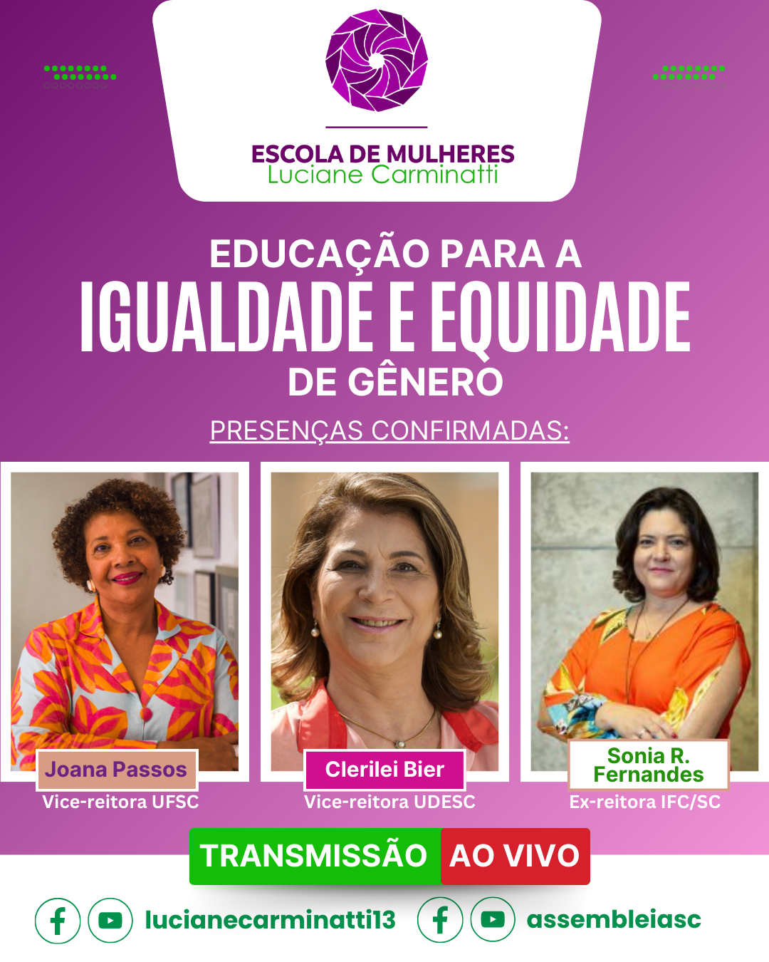 Para marcar a data, será realizada uma roda de conversa com três mulheres de destaque no Estado: Joana Passos (vice-reitora da UFSC), Clerilei Bier (vice-reitora da Udesc) e Sonia Regina Fernandes (ex-reitora do IFC/SC). O bate-papo será intermediado por Luciane.