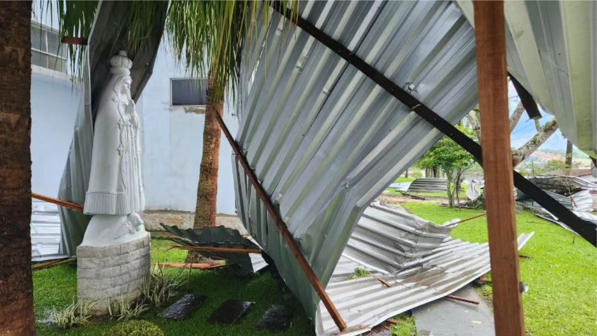 Temporal atingiu a pequena cidade de Rio do Campo, no Alto Vale do Itajaí, no fim da tarde desta sexta-feira (5). Apesar dos danos, não há informações de pessoas feridas. Uma das fotos mais emblemáticas do temporal foi justamente na igreja de São José: telhado caído no entorno de uma imagem de Nossa Senhora Aparecida que ficou intacta