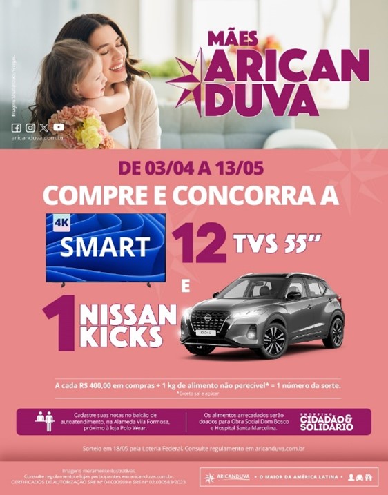 Para celebrar o Dia das Mães, o Shopping Aricanduva, maior centro comercial da América Latina, anuncia a Campanha “Mães Aricanduva”. Os participantes concorrerão a 01 automóvel Nissan Kicks Automático e a 12 Tvs Smart 4K 55”. A campanha ocorre até o dia 13 de maio.