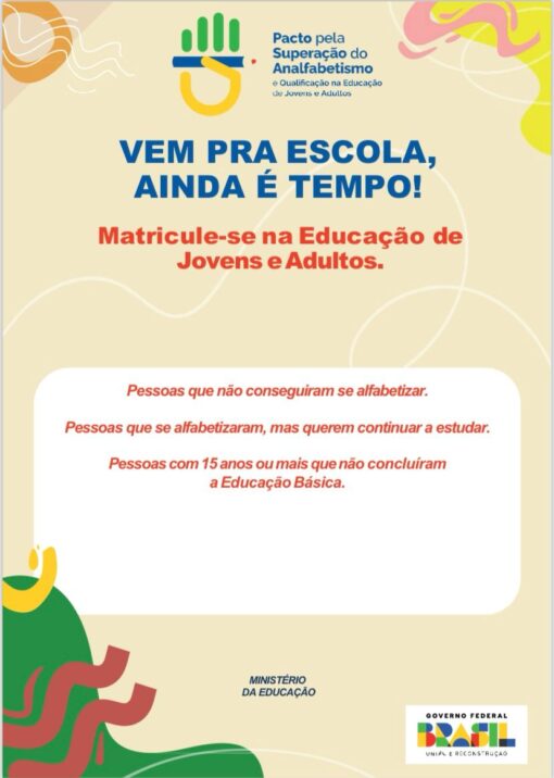Vamos juntos divulgar essa campanha. Converse com aquela tia que sempre quis aprender, com o vizinho que vive pedindo ajuda para ler os papéis do banco, com o colega que abandonou a escola cedo demais. Incentive, acompanhe, matricule!