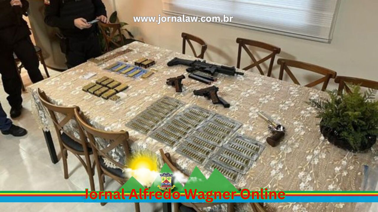 Durante a operação, os agentes localizaram e apreenderam diversas armas de fogo, munições e outros objetos de interesse para o inquérito em andamento.
