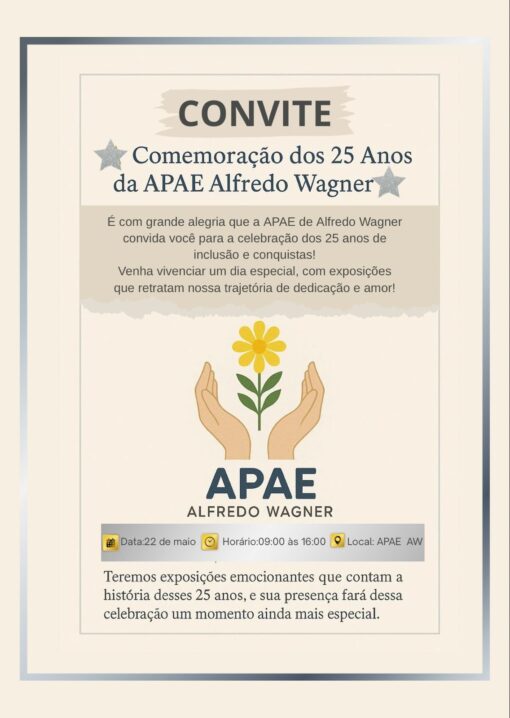 Neste aniversário, a APAE de Alfredo Wagner é motivo de orgulho para todos. Que esta data reforce ainda mais o compromisso coletivo com a inclusão, com a empatia e com o cuidado. E que os próximos anos continuem sendo escritos com amor, respeito e a certeza de que juntos podemos construir um mundo melhor para todos.