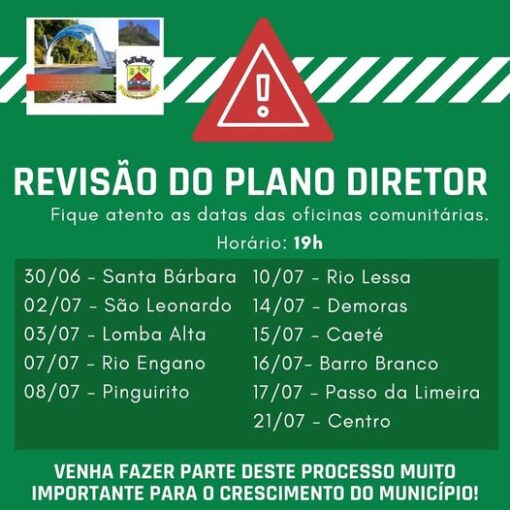 A Prefeitura de Alfredo Wagner está realizando a revisão do Plano Diretor Municipal, e convida toda a população a participar das oficinas comunitárias que ocorrerão em diversas localidades do município entre os dias 30 de junho e 21 de julho. A participação de cada cidadão é essencial para definir os rumos do crescimento e do desenvolvimento urbano de Alfredo Wagner nos próximos anos.