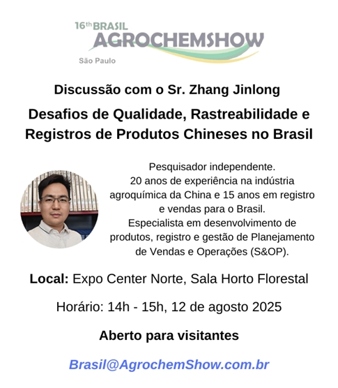 Com 20 anos de atuação na indústria agroquímica chinesa e mais de uma década de experiência no mercado brasileiro, o pesquisador Jinlong Zhang será um dos destaques do 16º Brasil AgroChemShow. Realizado no Expo Center Norte, em São Paulo, o evento será realizado nos 12 e 13 de agosto.