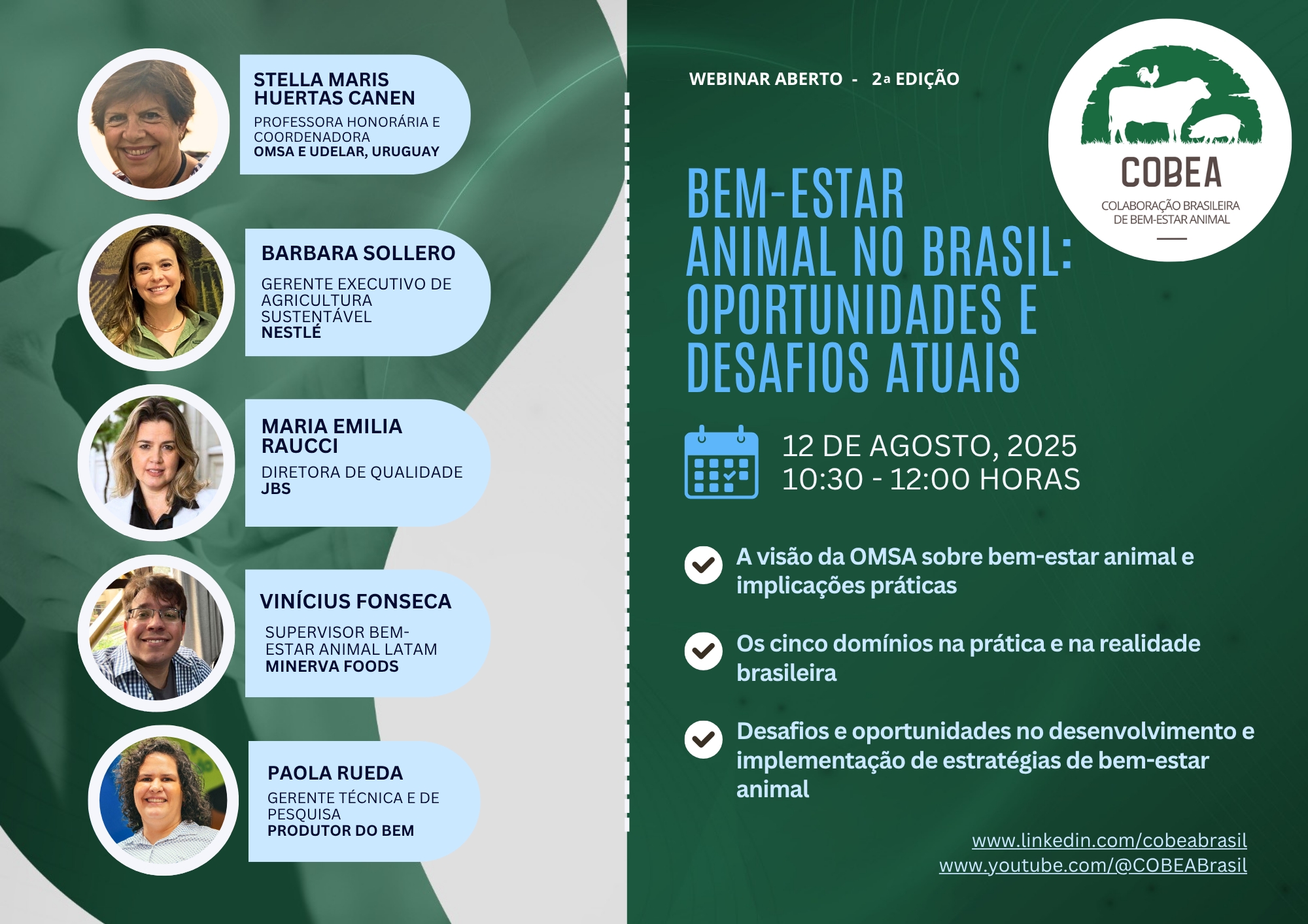 “Bem-estar animal no Brasil: Oportunidades e desafios atuais” é o tema do segundo webinar organizado pela Colaboração Brasileira de Bem-Estar Animal (COBEA), que será transmitido gratuitamente no dia 12 de agosto, a partir das 10h30, pela plataforma Zoho. O evento online terá participação de representantes da Organização Mundial de Saúde Animal (OMSA) e de algumas das principais empresas alimentícias do Brasil e atuais membros do COBEA.