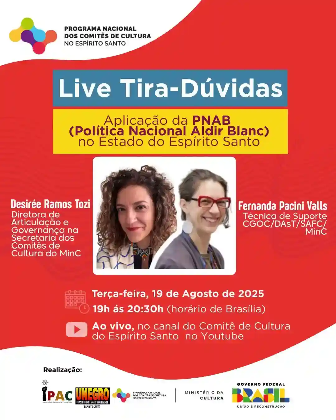 O Comitê de Cultura do Espírito Santo, referência no apoio às políticas culturais e à promoção da cultura no estado a participar da Live Tira-Dúvidas sobre a aplicação da Política Nacional Aldir Blanc (PNAB) no estado. Este evento online será transmitido ao vivo pelo canal do Comitê de Cultura do Espírito Santo no YouTube, no dia 19 de agosto de 2025, das 19h às 20h30 (horário de Brasília).