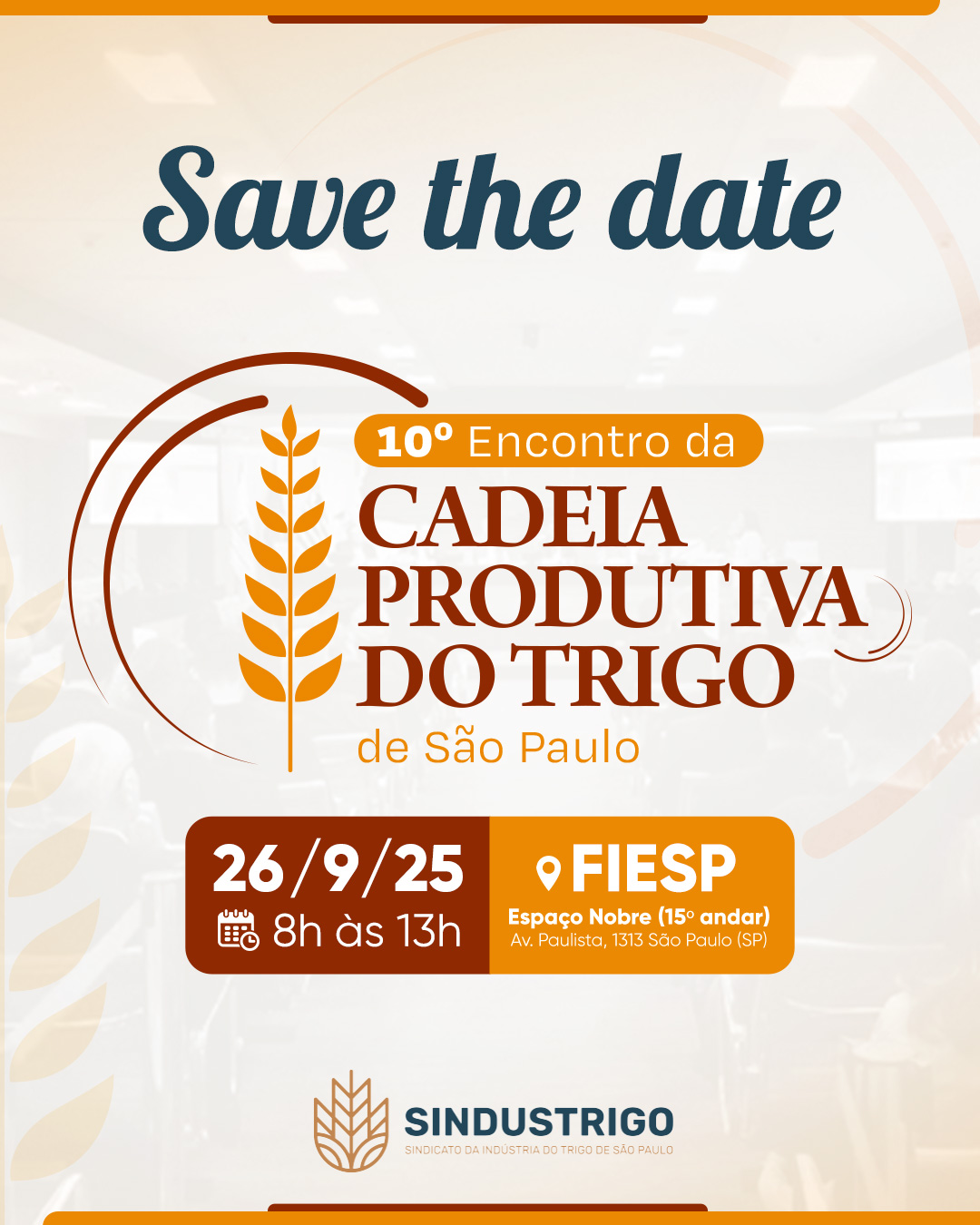 Comemorando uma década de debates e diálogos em prol do desenvolvimento do setor do trigo paulista, o Sindicato da Indústria do Trigo do Estado de São Paulo (Sindustrigo) promove o 10º Encontro da Cadeia Produtiva do Trigo de São Paulo, no dia 26 de setembro, na Fiesp. Em formato híbrido, o evento também será transmitido ao vivo pelo canal do Sindustrigo no YouTube.