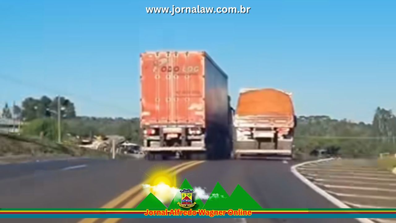 Dois caminhoneiros foram flagrados disputando espaço na BR-282, em Ponte Serrada, no Oeste catarinense, na tarde desta terça-feira, dia 16.