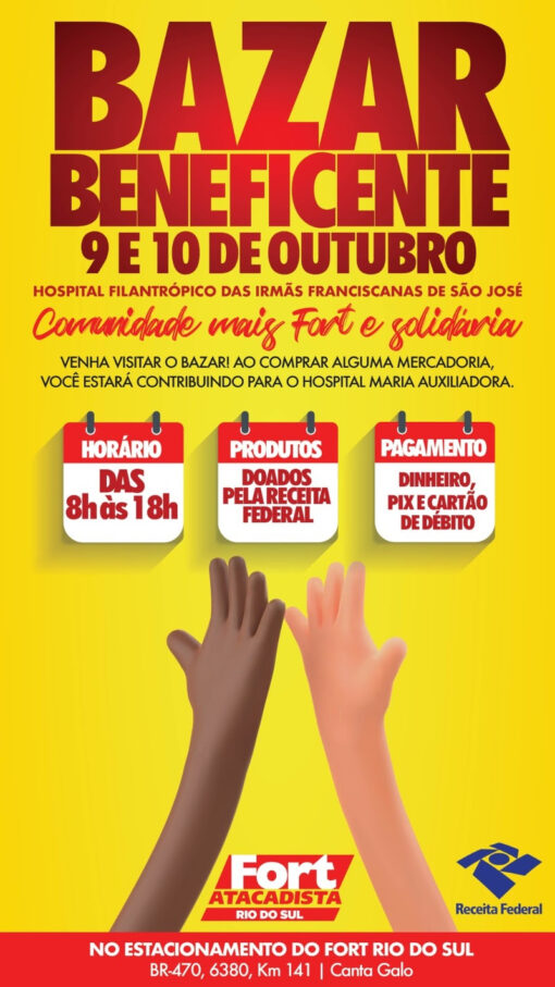 Nos dias 9 e 10 de outubro, o estacionamento do Fort Atacadista de Rio do Sul será palco de um grande bazar beneficente em prol do Hospital Maria Auxiliadora, de Presidente Getúlio. A iniciativa é organizada pelo Hospital Filantrópico das Irmãs Franciscanas de São José e funcionará das 8h às 18h.