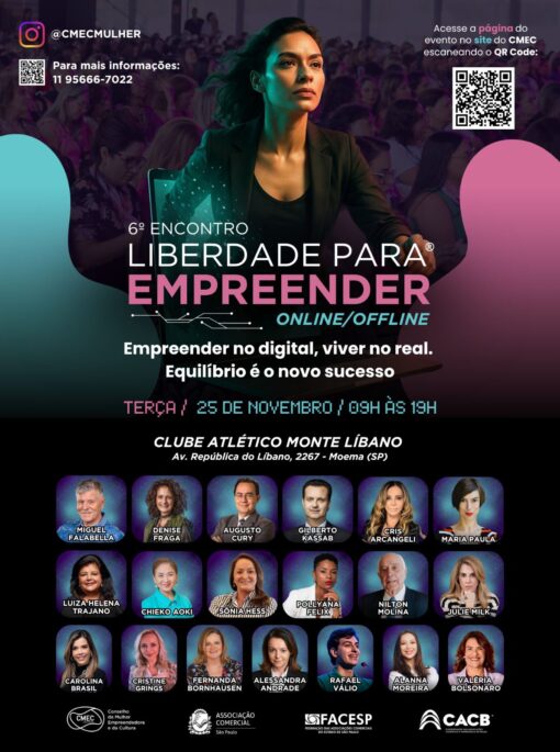 No dia 25 de novembro vai acontecer a 6º edição do Liberdade para Empreender com o tema: On-line/Off-line – Empreender no Digital e Viver no Real: Equilíbrio é o Novo Sucesso, das 8h às 19h, no Clube Atlético Monte Líbano, em São Paulo. Promovido pelo CMEC – Conselho da Mulher Empreendedora e da Cultura, órgão da ACSP – Associação Comercial de São Paulo, da FACESP – Federação das Associações Comerciais do Estado de São Paulo e da CACB – Confederação das Associações Comerciais e Empresariais do Brasil, o evento reunirá especialistas em gestão, saúde emocional, tecnologia, longevidade e inovação para falarem sobre os desafios de empreender e viver em um mundo cada vez mais digital, com foco no equilíbrio e bem-estar.
