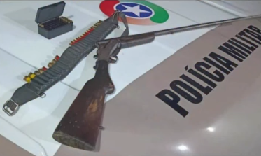 No local, foram apreendidos uma espingarda calibre 28, munições calibre 28 e 38, além de diversos pássaros silvestres mantidos em gaiolas sem anilhas.