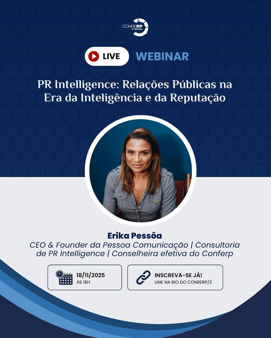 O Conselho Regional de Profissionais de Relações Públicas da 2ª Região promove, no dia 18 de novembro, às 18h, um webinar especial com a participação de Erika Pessôa, CEO & Founder da Pessoa Comunicação | PR Intelligence e conselheira efetiva do Conselho Federal de Profissionais de Relações Públicas (CONFERP).