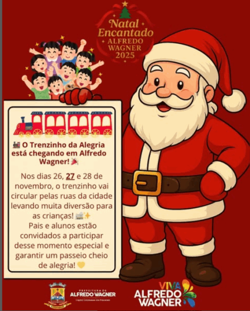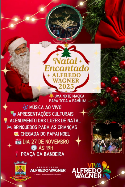 O clima natalino já toma conta de Alfredo Wagner, e neste ano a programação promete encantar crianças, jovens e famílias inteiras. A Prefeitura prepara uma série de atividades especiais que irão iluminar o município entre os dias 26, 27 e 28 de novembro, reunindo diversão, cultura e o verdadeiro espírito de Natal.