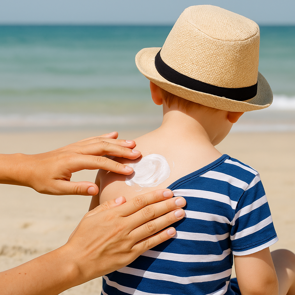 A partir dos seis meses, o uso do protetor solar é liberado. Antes disso, a recomendação é evitar exposição direta ao sol e apostar em barreiras físicas, como roupas e chapéus. Prefira filtros minerais (físicos), com dióxido de titânio ou óxido de zinco, que formam uma camada protetora sobre a pele e são menos propensos a causar alergias. Aplique cerca de 20 minutos antes da exposição e reaplique a cada duas horas, especialmente após mergulhos ou transpiração intensa.