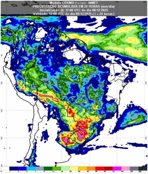 A previsão indica maior risco no Rio Grande do Sul, Santa Catarina, Paraná, São Paulo e Mato Grosso do Sul