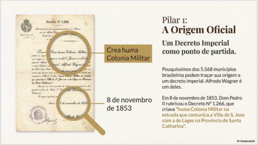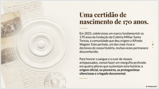 Nesta série de slides apresentamos um resumo da história de Alfredo Wagner cuja base são os artigos publicados aqui no Jornal Alfredo Wagner Online em 2023 por ocasião dos 170 anos do decreto imperial que criou a Colônia Militar Santa Teresa.