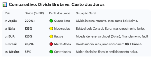 Em resumo, o Brasil não está sozinho no clube dos países endividados. A diferença é que, por aqui, o preço do dinheiro é muito mais alto — e é isso que transforma a dívida em um problema estrutural.