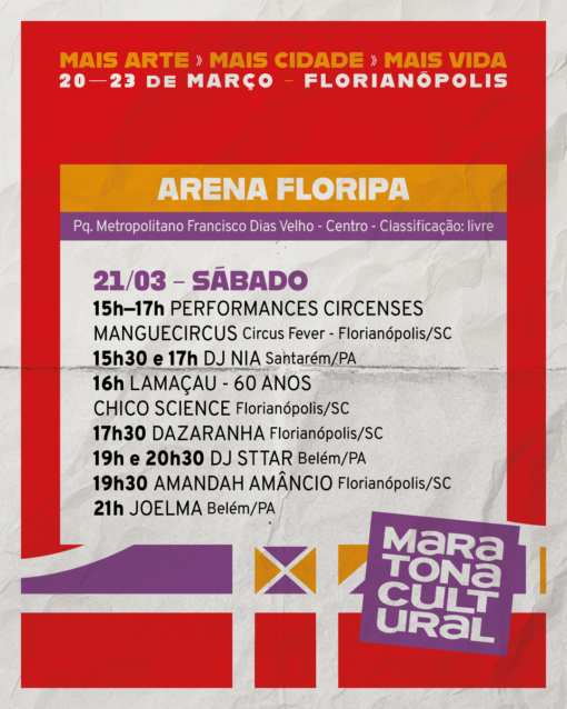 No sábado, 21 de março, as atividades iniciam às 15h com performances circenses do MangueCircus Circus Fever. Ao longo da tarde, sobem ao palco a DJ NIA, o espetáculo “Lamaçau – 60 anos Chico Science” e o grupo Dazaranha, um dos mais representativos da cena catarinense. À noite, o DJ STTAR e a cantora Amandah Amâncio preparam o público para o show de Joelma, marcado para às 21h.