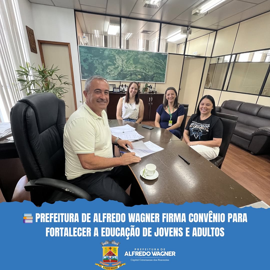 Foi realizada a assinatura do convênio entre a Secretaria de Estado da Educação e o Município de Alfredo Wagner, garantindo a continuidade da oferta da Educação de Jovens e Adultos (EJA) no município. ✍️📖
