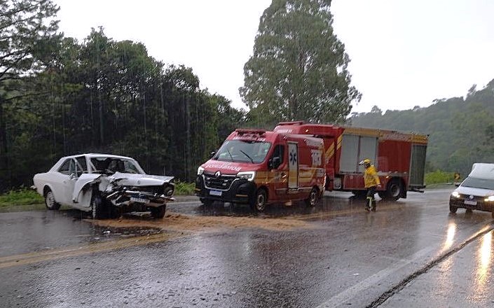 Uma colisão frontal mobilizou o Corpo de Bombeiros na tarde desta sexta-feira (6), no km 408 da BR-282. O acidente ocorreu por volta das 14h41, em um trecho de curva próximo à Ervateira Regina.
