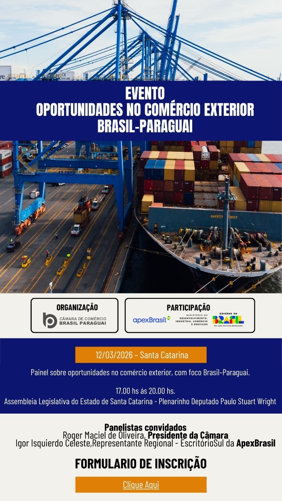 A Câmara de Comércio Brasil–Paraguai tem a honra de convidá-los para um evento presencial que tem como objetivo promover o diálogo empresarial e apresentar oportunidades estratégicas de integração entre Brasil e Paraguai.