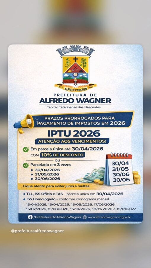 Os contribuintes de Alfredo Wagner ganharam um fôlego extra para organizar o orçamento neste início de ano. A Prefeitura Municipal anunciou a prorrogação dos prazos para o pagamento de tributos municipais, incluindo o IPTU 2026, com condições especiais para quem optar pela quitação antecipada.