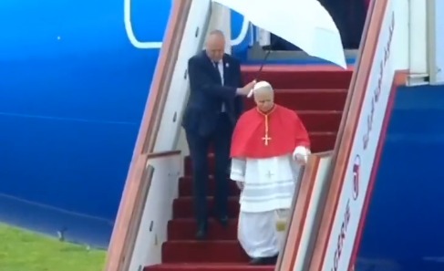 Nota ao leitor: A mozeta vermelha é usada tradicionalmente apenas durante o período do verão (em cetim) ou inverno (em veludo com bordas de arminho), mas seu uso em recepções diplomáticas de aeroporto havia caído em desuso, tornando este evento um marco histórico para o atual pontificado.