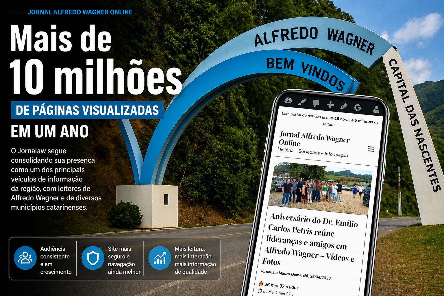 Ao longo dos últimos doze meses, o site https://jornalaw.com.br — jornal online de Alfredo Wagner — ultrapassou a marca de 10 milhões de páginas visualizadas, com acessos de leitores da região e de diversos municípios catarinenses. Os dados, gerados automaticamente pela plataforma de monitoramento do site, indicam uma audiência consistente e em crescimento.